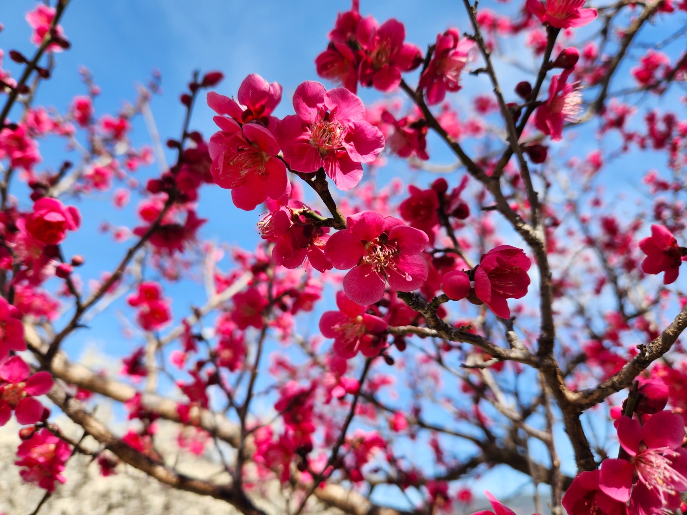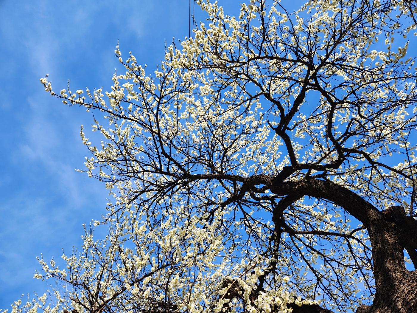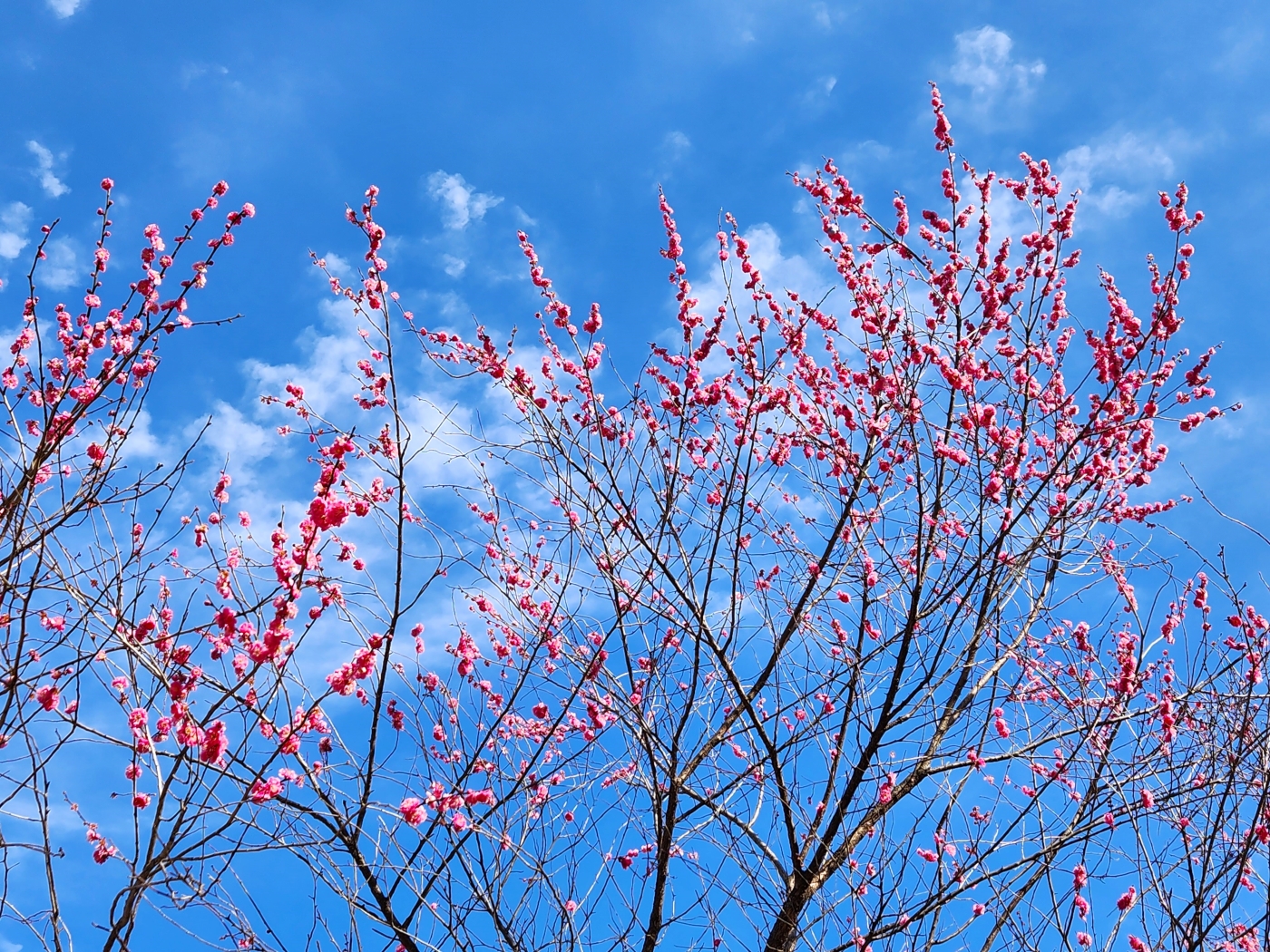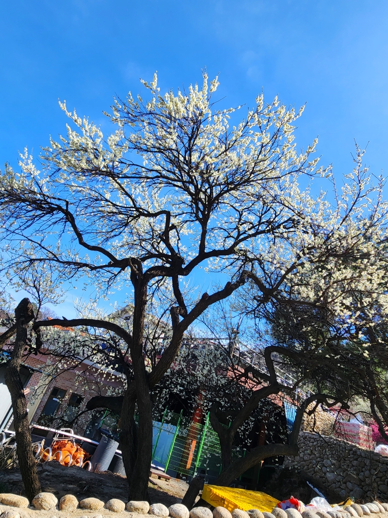 파란하늘에 활짝핀 매화가 쌀쌀한 바람에 파르르 떤다.