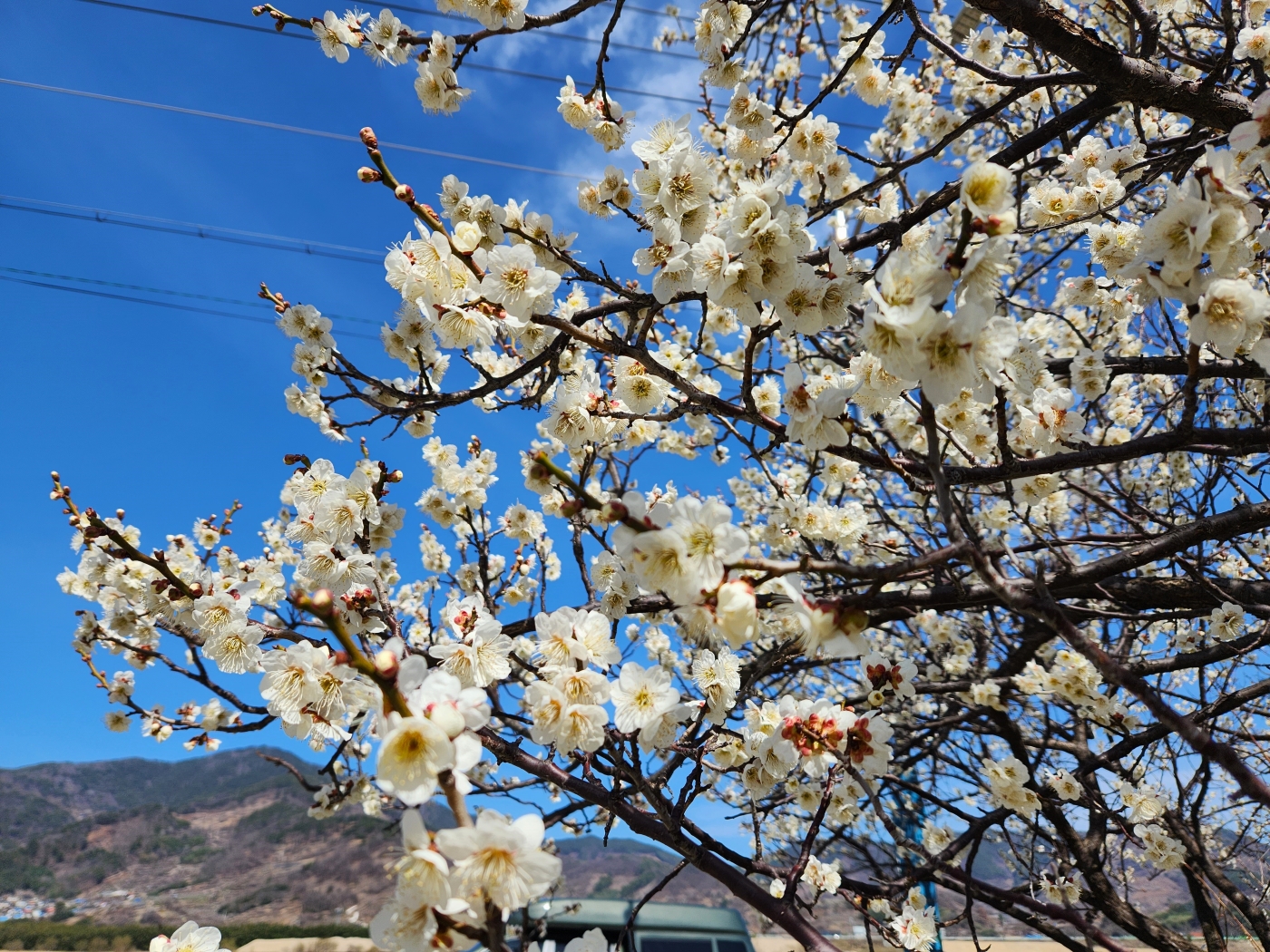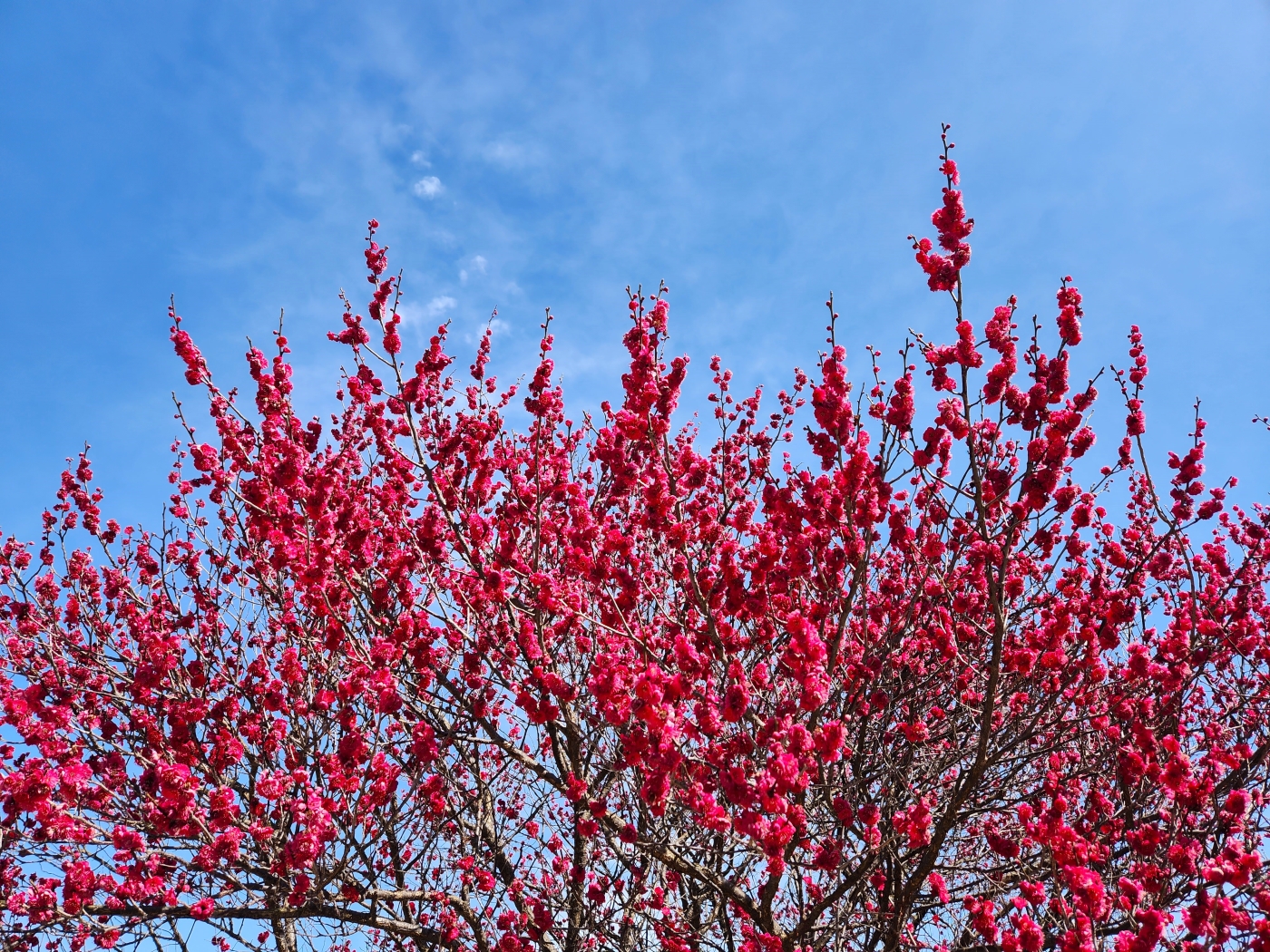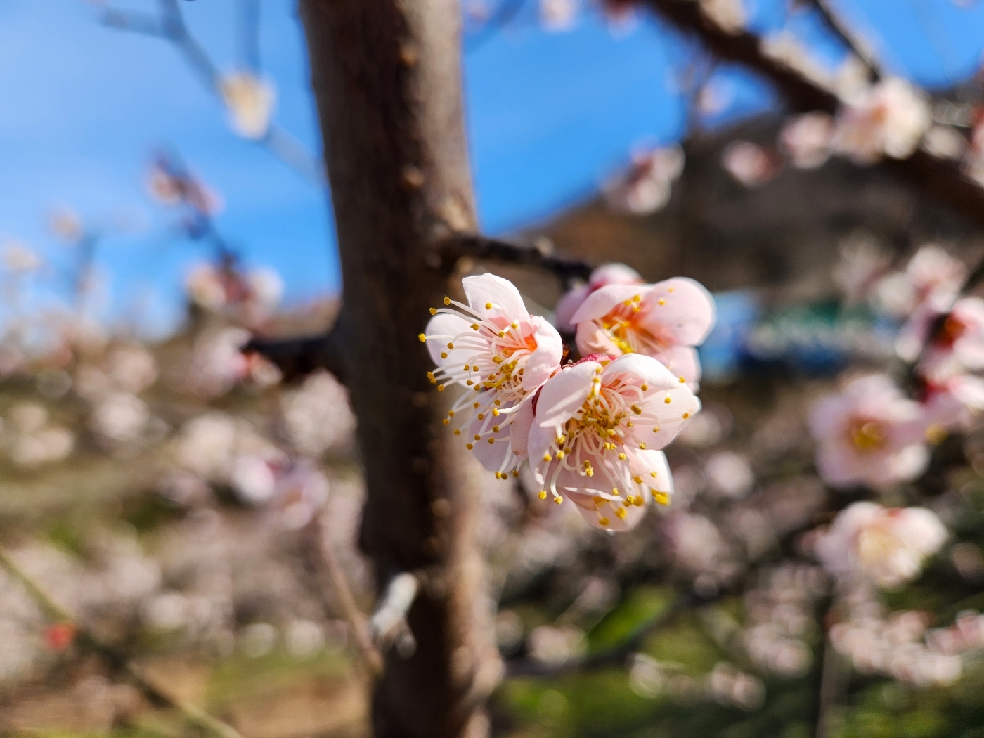 파란하늘에 활짝핀 매화가 쌀쌀한 바람에 파르르 떤다.