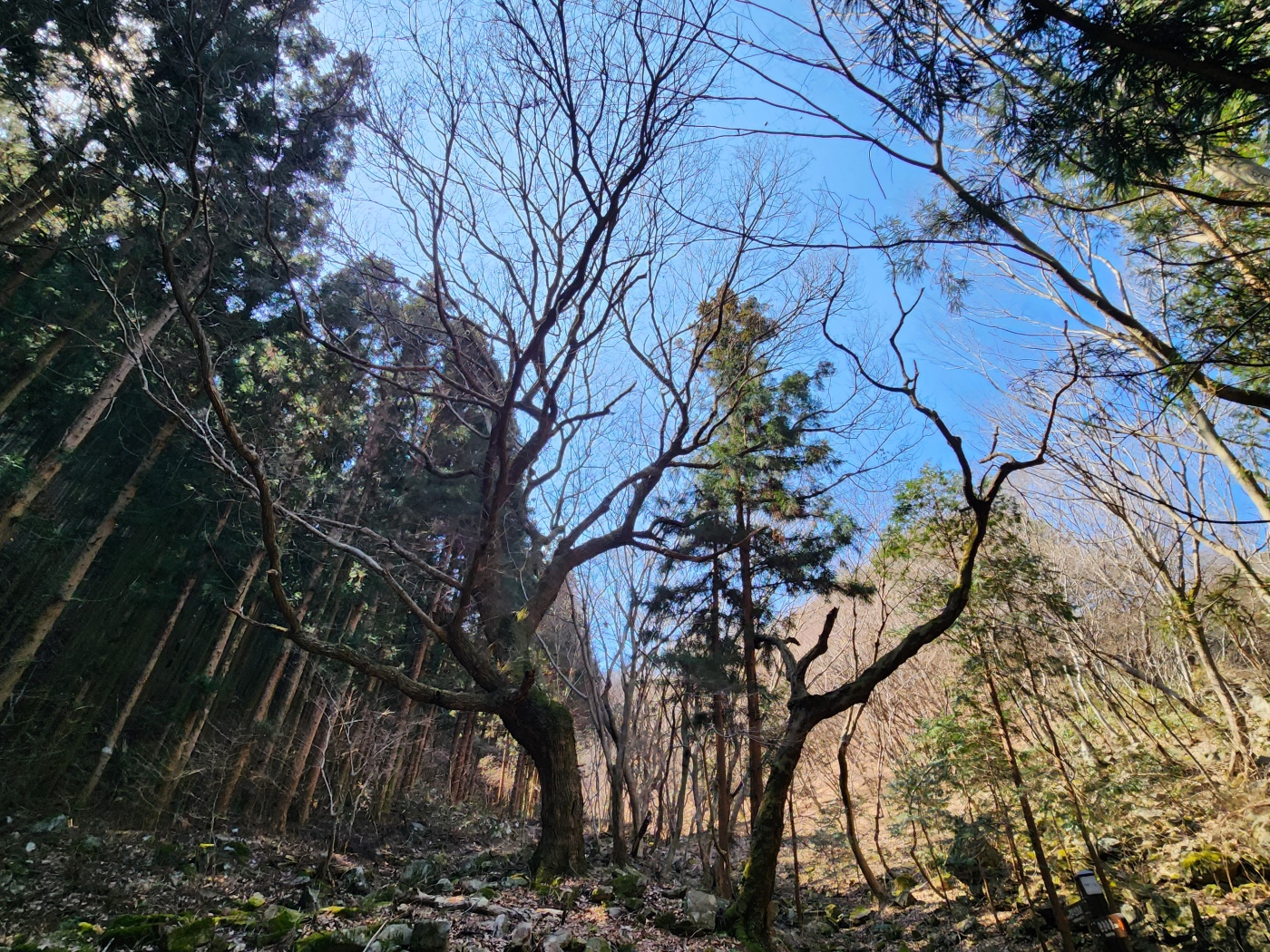 오른쪽으로 진행, 지류를 건너 삼나무 사면길을 따라 오르면