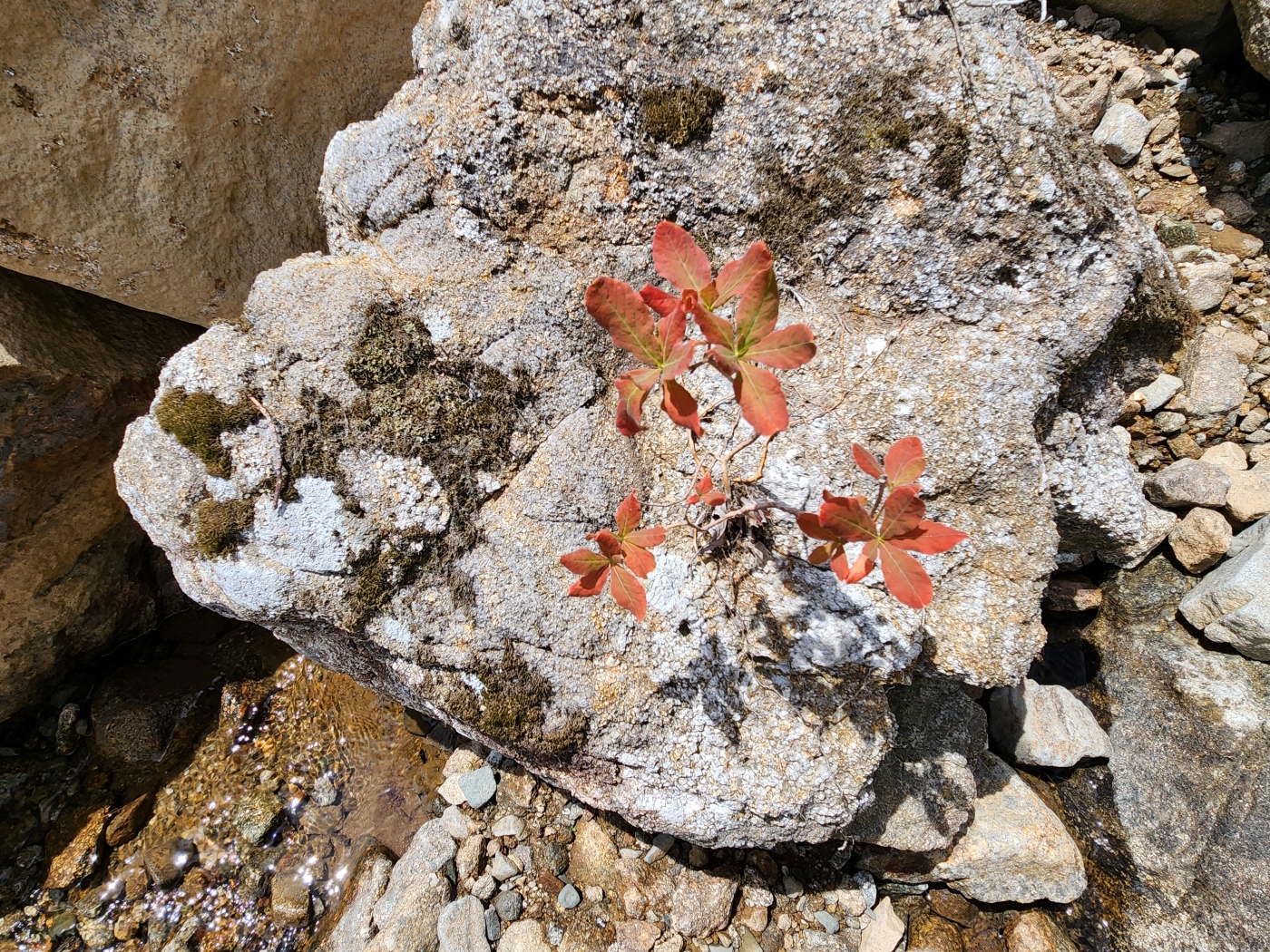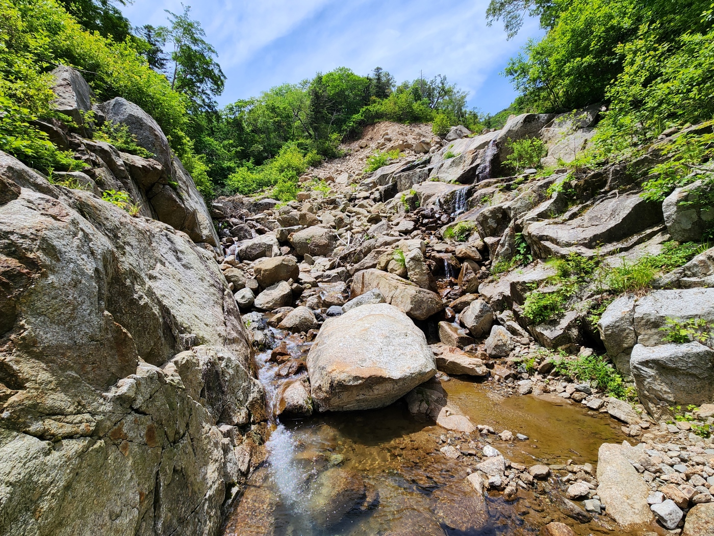 바위에 노란 화살표가 보이지만 물이 적어 골을 따른다.
