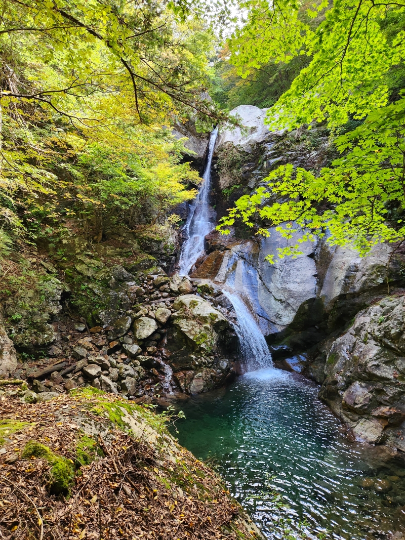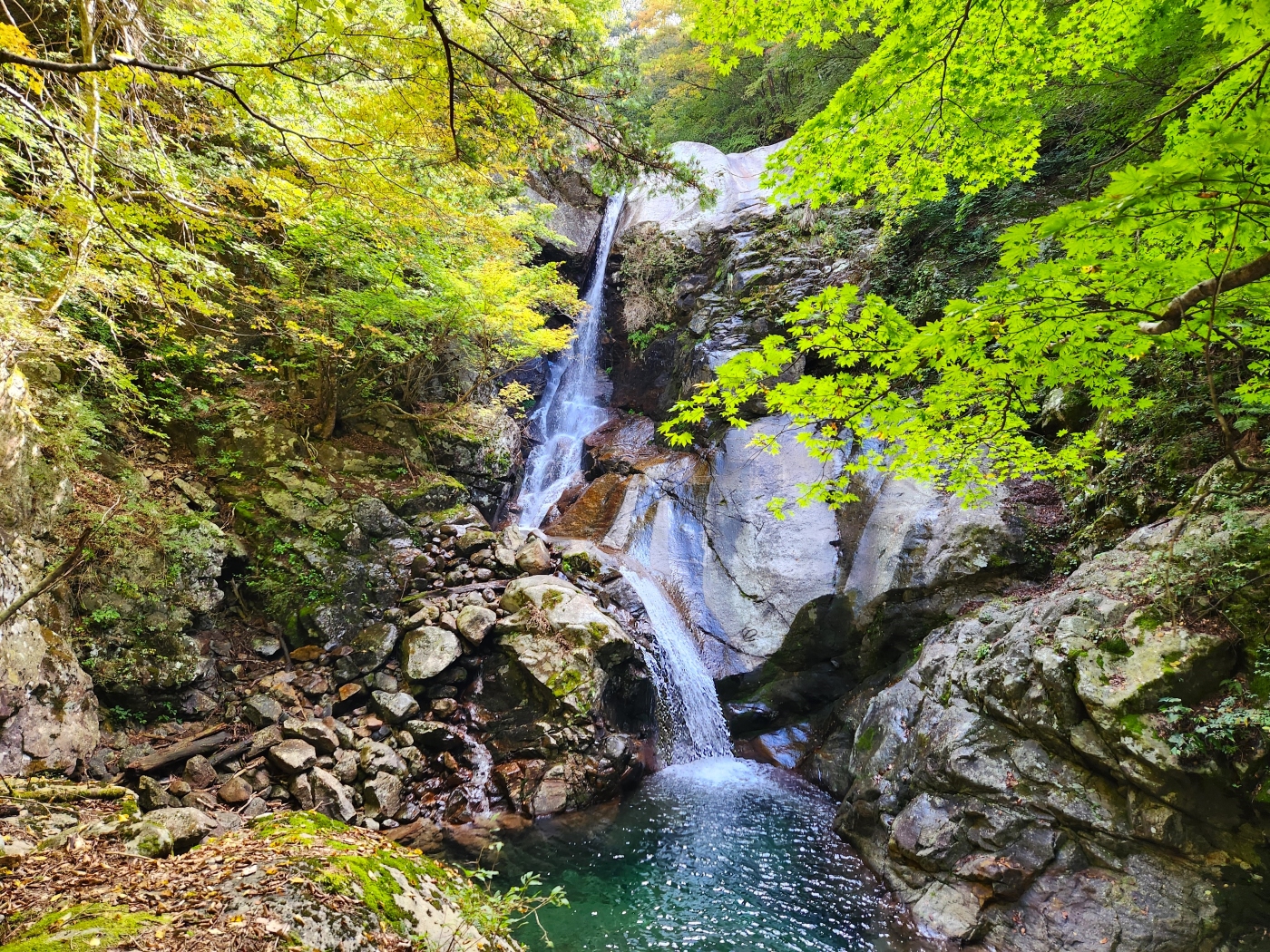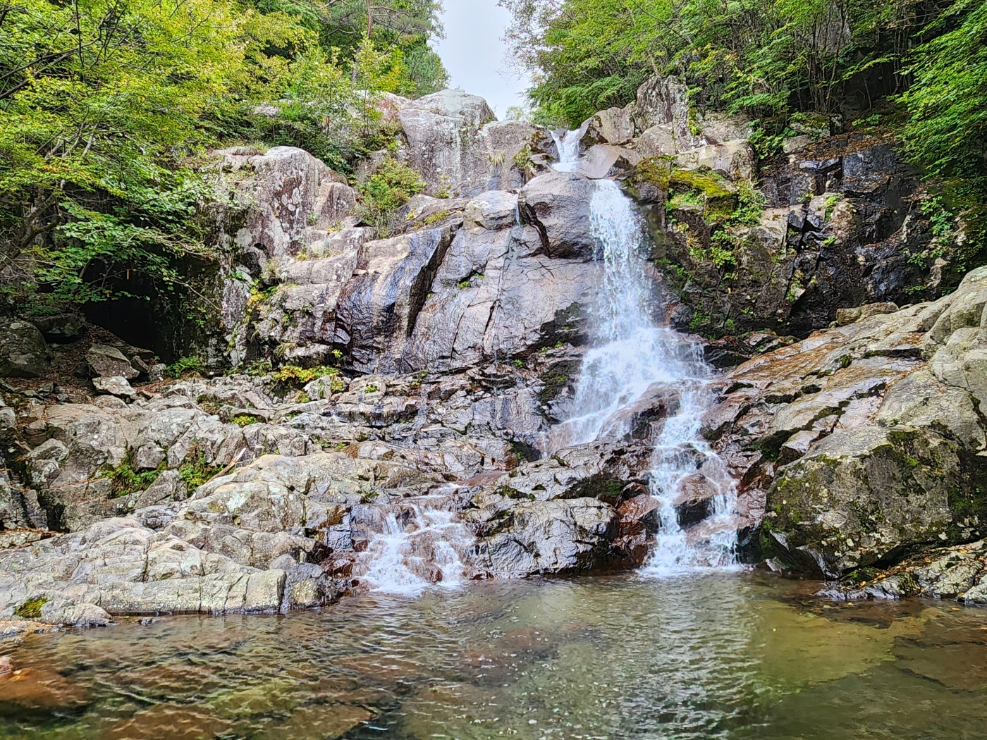 옛길은 오른쪽으로 멀어지지만 계곡을 따라 오르면 휘도는 지점에 폭포가 반긴다.