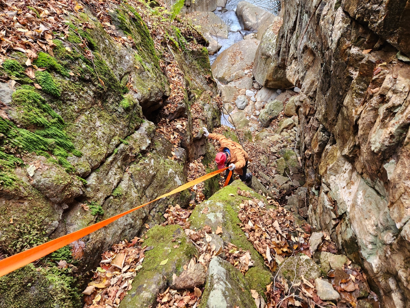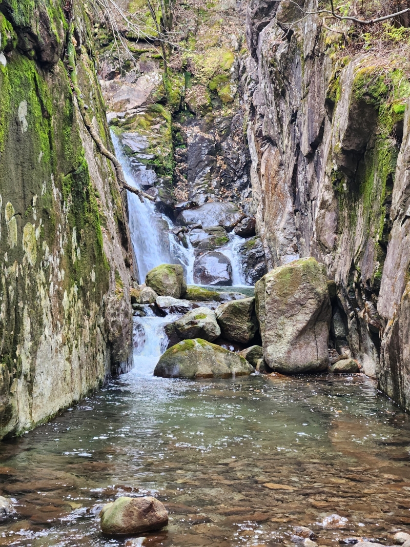 한신폭포 상단 위쪽 살피고 바위사이로 되돌아가 한신폭포 아래로 간다.