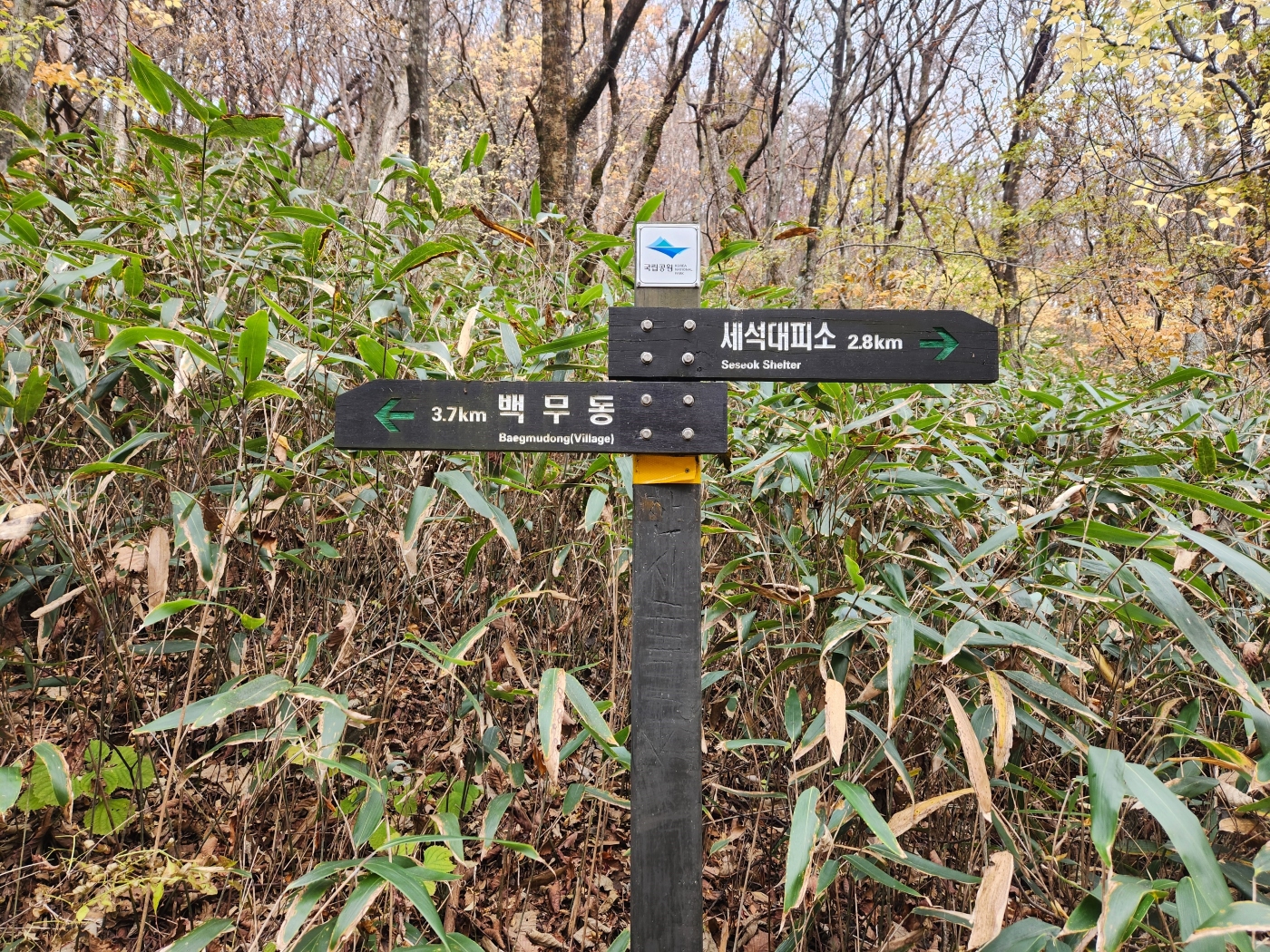 백무동 3.7km 이정표에서 등로 오른쪽 아래 산죽 속으로 내려가