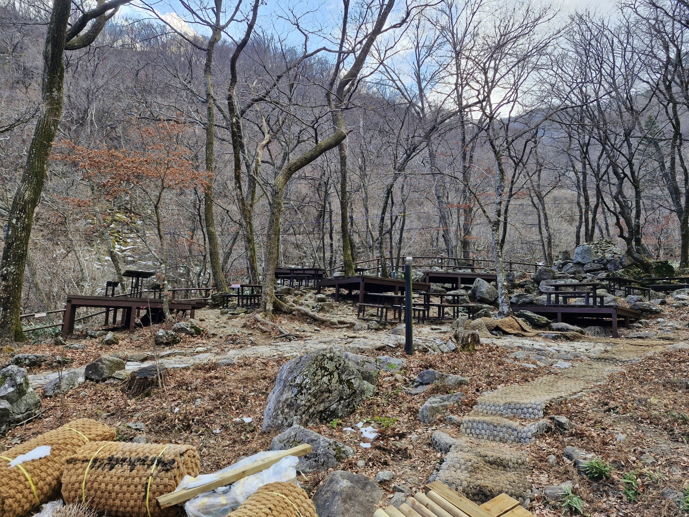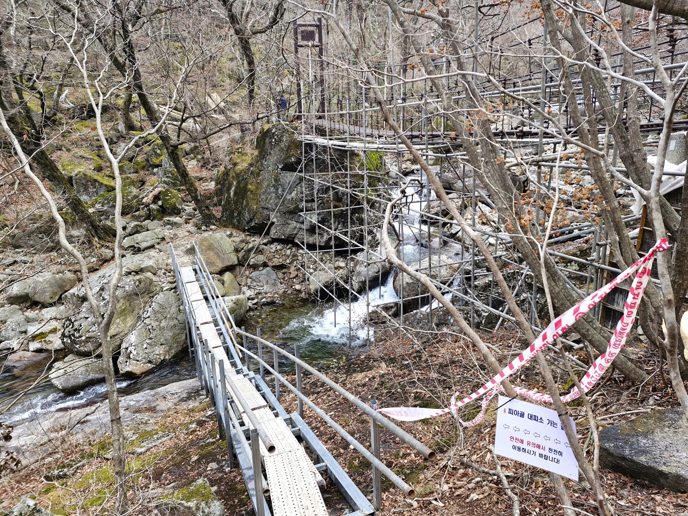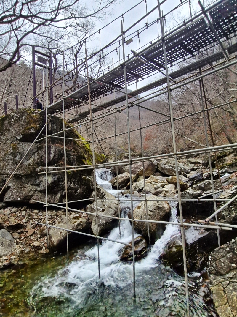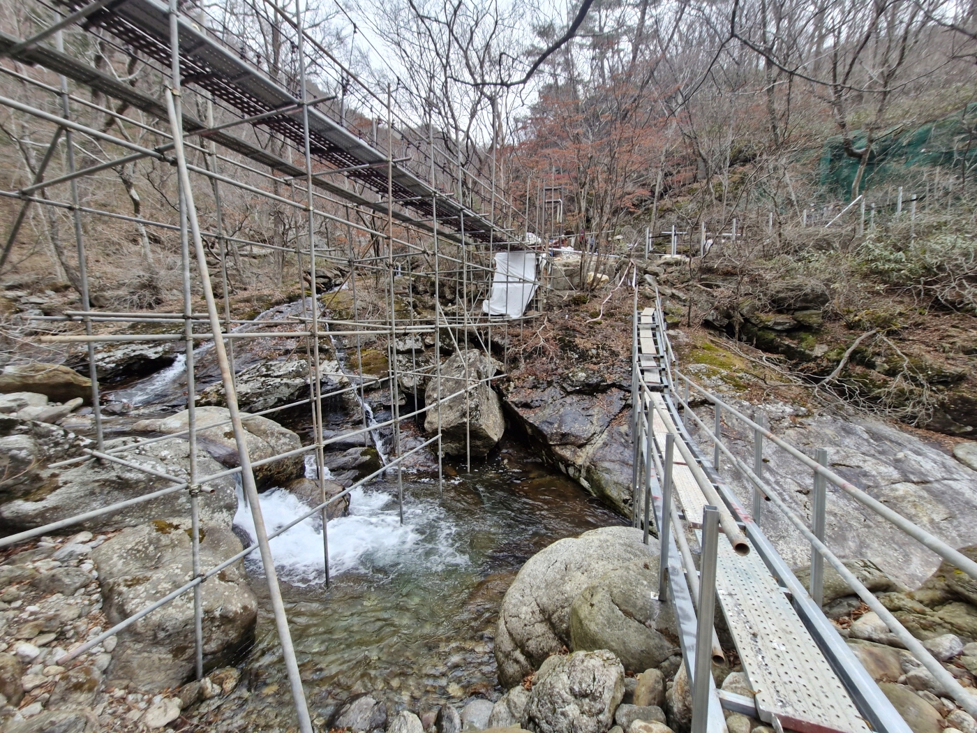 옛 생각하며 올라가니, 구계폭포 다리 공사중이다.