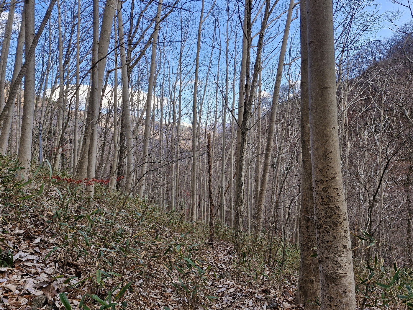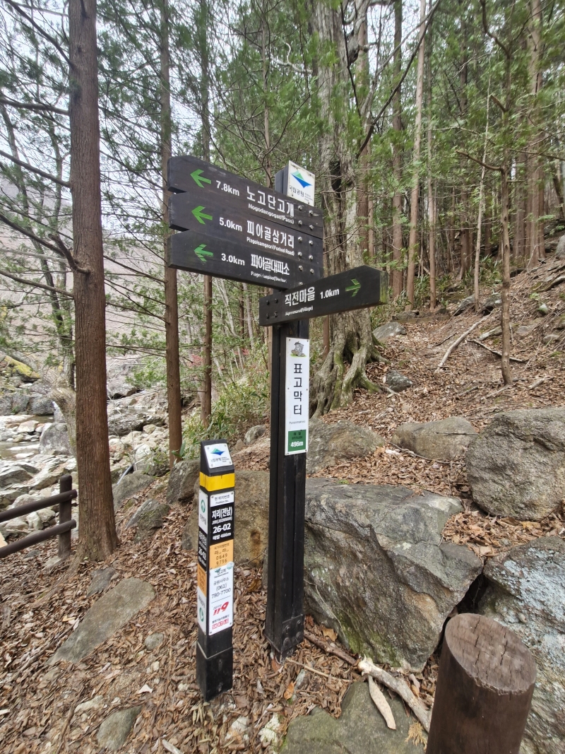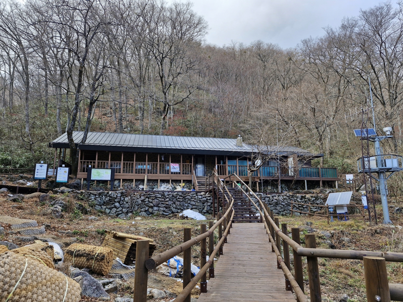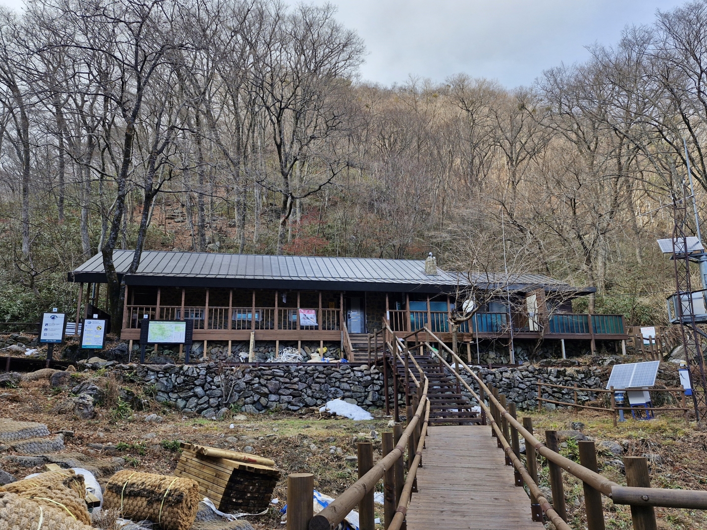 갑자기 오른쪽 산죽 속에서 "크으흥~~" 소리가 나며 큰 짐승이 움직인다. '나를 보고 놀랬나?' 정신차리고. 대피소 왼쪽으로 다가가 살펴보니 사라졌다. 의자에 앉아 점심 먹으려 했으나 되돌아오며 .내가 서상대 올라갈 줄 알았나?' ㅎ