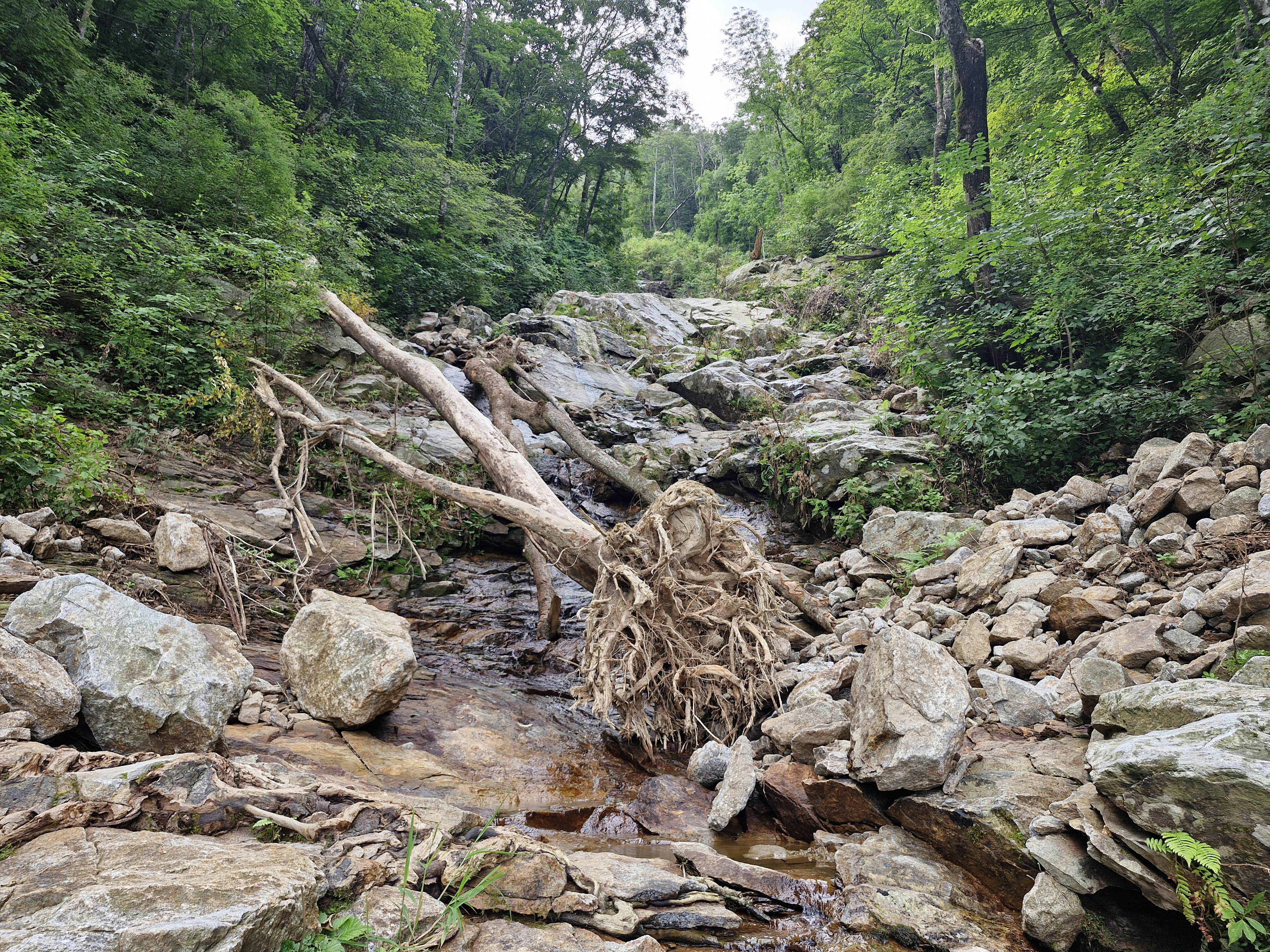 폭우에 뿌리 뽑힌 나무가 뒹굴고, 깨끗하게 휩쓸리고, 돌무더기가 쌓여 있습니다.