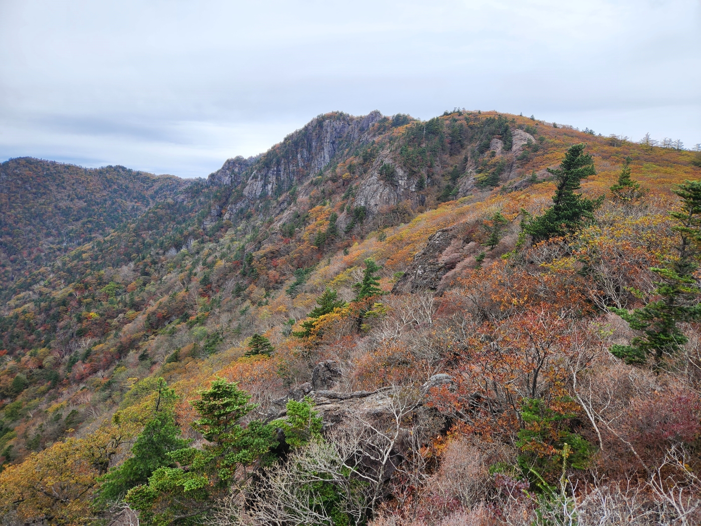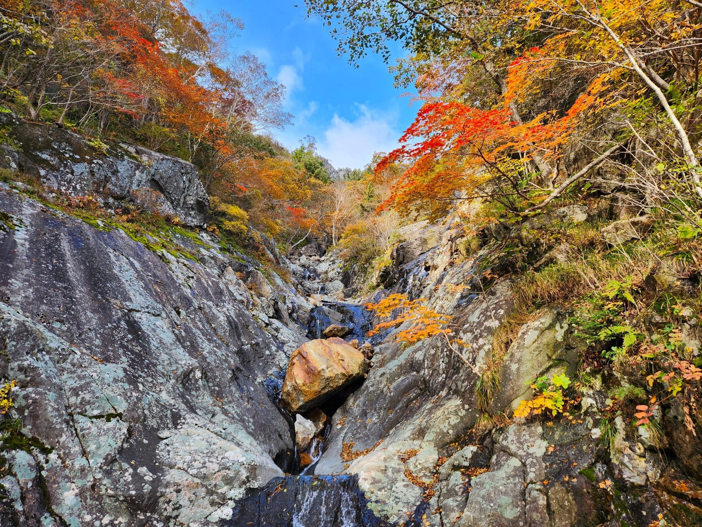 * 2024년 10월 16-17일 * 통신골~통천문 위~장터목~천왕봉~천왕굴~중봉~중봉골* 흐린 날 짝꿍이랑 통신골로 올라 중봉골로... * 홈바위 위로 단풍이 보이더니 통신골 초입부터 마음에 듭니다. 전날에도 비가 내려 생각보다 수량이 많고 미끄러워 애를 씁니다. * 구름이 순식간에 밀려와 잠깐 햇빛에 반짝이는 단풍보느라 더딥니다. 주능은 군데군데 단풍이 보이나 비바람에 떨어진 잎이 더 많습니다. * 천왕봉 일출을 보고, 천왕굴에서 단풍이 고운 중봉으로 갑니다. 중봉에서 태극능선 바라보고 아쉽지만 중봉골로 향합니다. * 폭포 아래 쉬어가는데, 산님(지난 달 통신골에서 만난)이 내려옵니다. 인사를 나누고, 날렵하게 골을 타고 내려가는 산님을 바라봅니다. ㅎ 물색이 고와 들여다보고오를수..