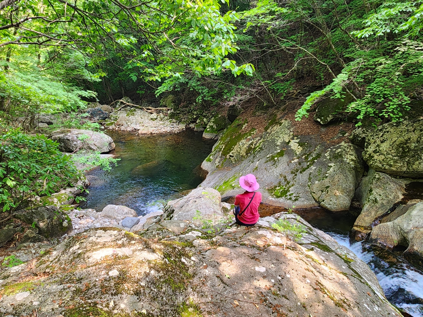 * 2024년 06월 26일 (수) * 윗새재~조개골~치밭목~써레봉~무제치기폭포~윗새재* 맑고 더운 날 짝꿍이랑 조개골 폭포를 보러... 상류암터 들머리 살피고철모 삼거리 우량기 위로 청이당옛길을 보내고손을 담그며 잠시 다리쉼을 한다.작은 조개골을 건너조개골과 가까와져 그늘에서 쉬어간다.조개골 건너는 지점에함박꽃이 너무 높이 달려 있다. 또 있겠지~~ ㅎ물소리 들으며 쉬엄쉬엄 올라가니눈에 익은 큰조개골 합수부.^^아기자기한 연폭이 흐른다.^^오른쪽에서 합수되는 큰조개골바위에 노란 화살표가 보이지만 물이 적어 골을 따른다.이번엔 높지않아 함박꽃 진한 향에 취해본다.^^조개골 폭포 너럭바위에서귀여운 모습도 들여다보고노루오줌꽃 피기 시작히~야~~ 언제봐도 멋진 폭포다.조개골 최애폭포 ㅎ폭포 상단에 올라..